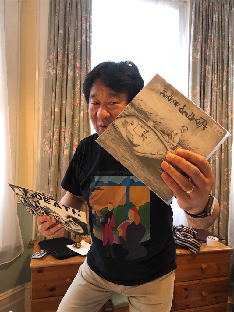 ロンドンのホテルにて撮影。この前日、ラフ・トレードのポートベロロード本店でThe Southern Death Cultのデビューシングル、Fatmanが見つかり大興奮のジェントルマン。ブライアン・イーノのTシャツを着ているのは、この後フォートナム&メイソンでグロスミスのブルック一家にお会いすべく、若い頃ブライアン・イーノの大ファンだったアマンダ・ブルックさんに敬意を表するため