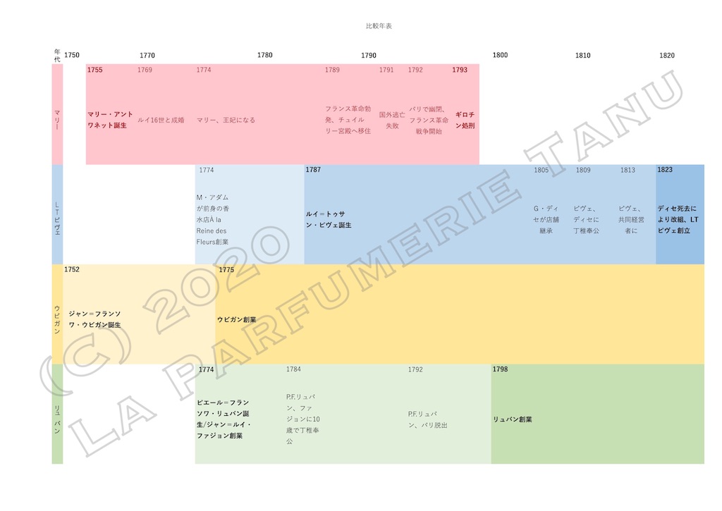 それでは、本題に入る前に、マリー・アントワネットと3ブランドの関係を簡単にご紹介します。お手元のカラー年表を見ながら聞いてください。ちなみに、これからお話する各ブランドの歴史について、どこどこのご用達とか、そういう素敵な話は、どこも公式サイトで目玉アイテムとして紹介していますので、各自ご確認いただく事にして、キャバレーではもっと客観的にお話したいと思います。