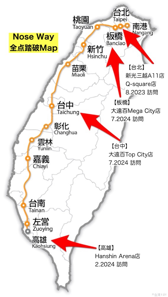 今回は、台北から台湾高鐡(新幹線)で約1時間の台中に南下、市内№1デパートの大遠百Top City店に入っている台中店へ。こちらは今年6月にピュアディスタンス創業者、ヤン・エワウト・フォス社長を迎えトークイベントが開催された、Nose Wayの中でもイベント開催に最適な大型店です。次に新幹線で台北の隣市にあたる板橋へ移動、板橋最大&最新デパート・大遠百Mega Cityに入っている板橋店を訪問しました。