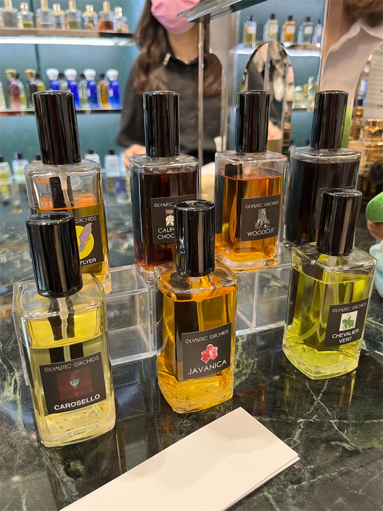 オリンピック・オーキッズは板橋店でも新ブランドとして全面フィーチャーしていて、台中店では試さなかった、だいぶベクトルの違う香りを2種ご紹介いただきました。